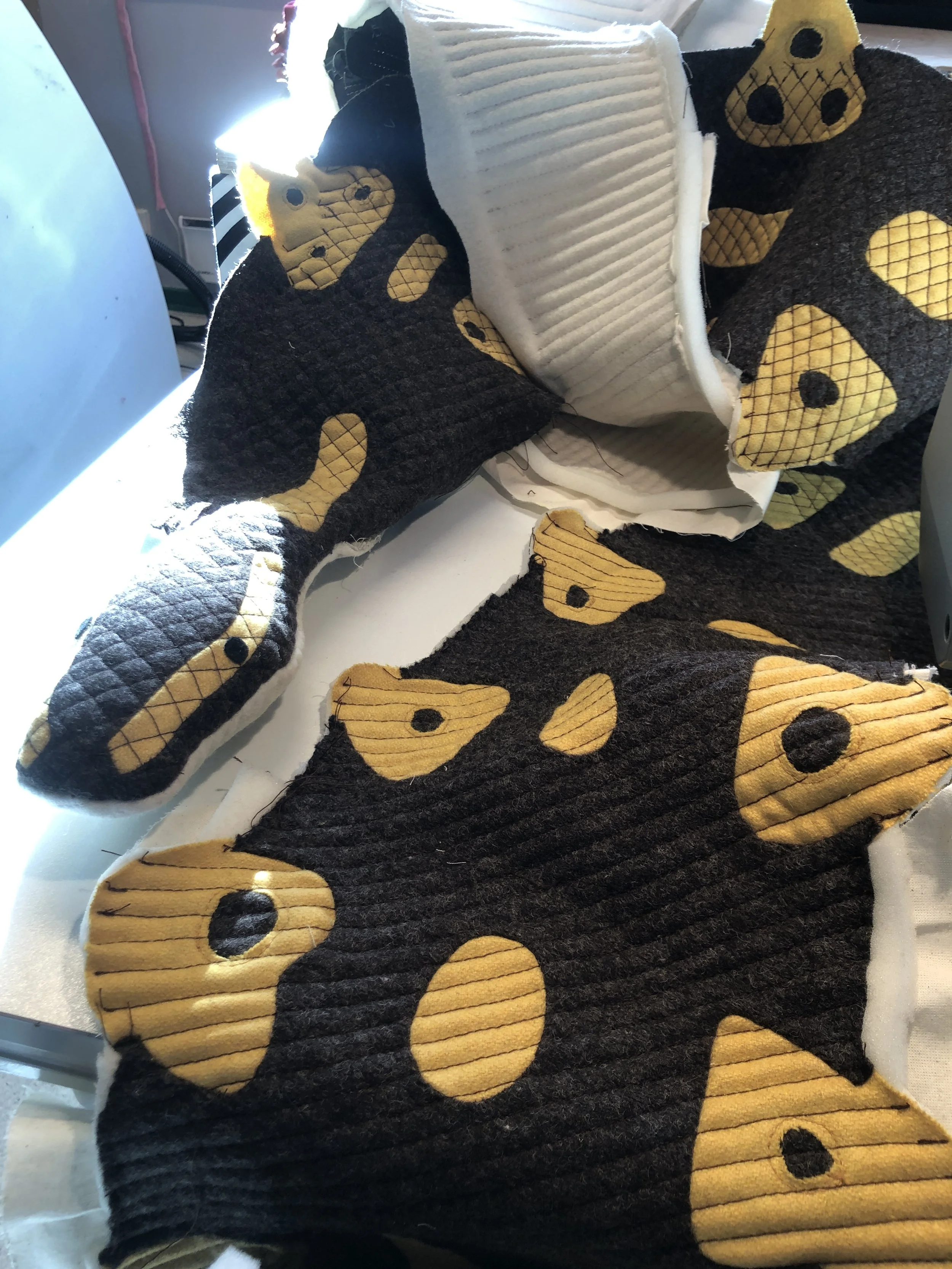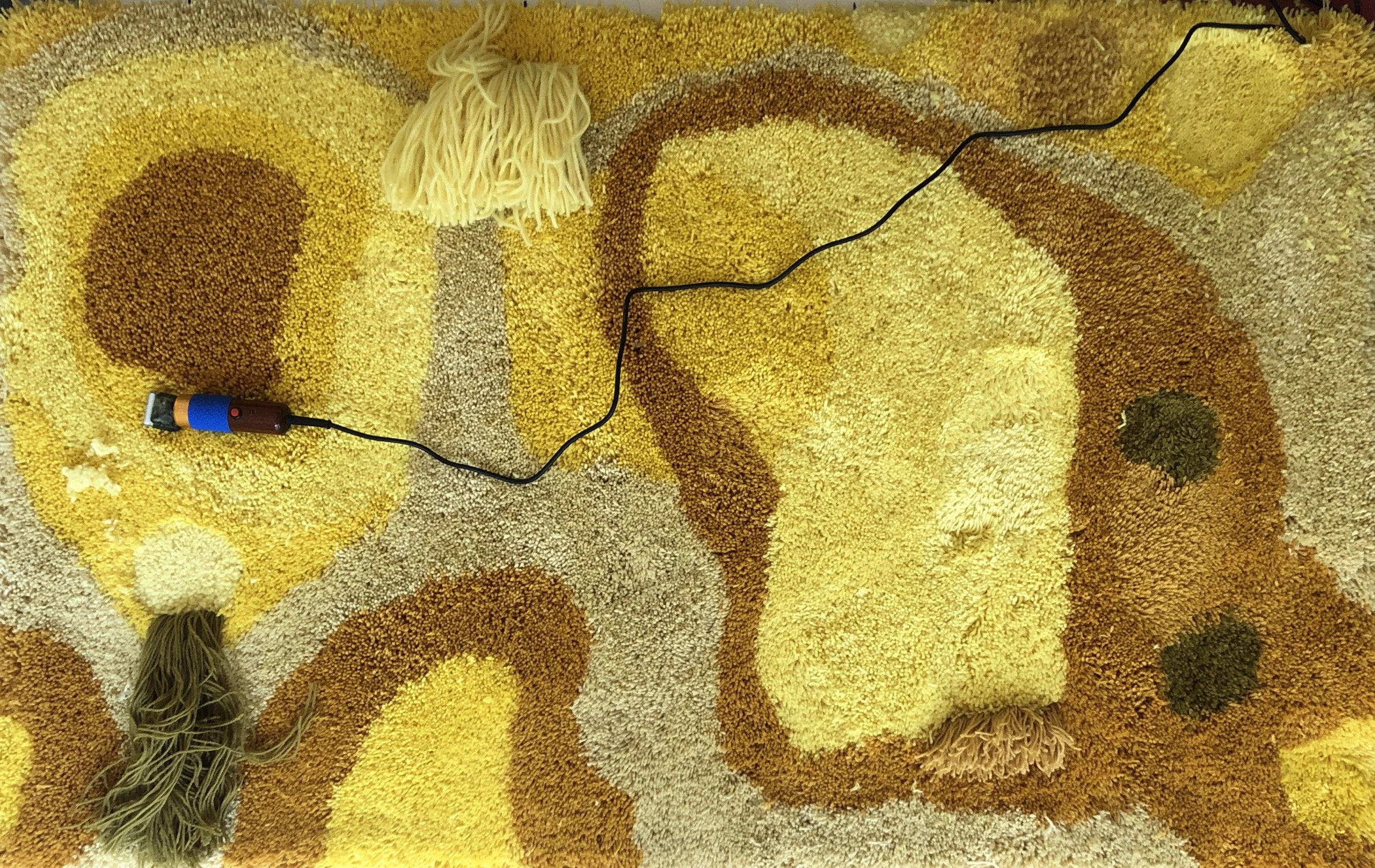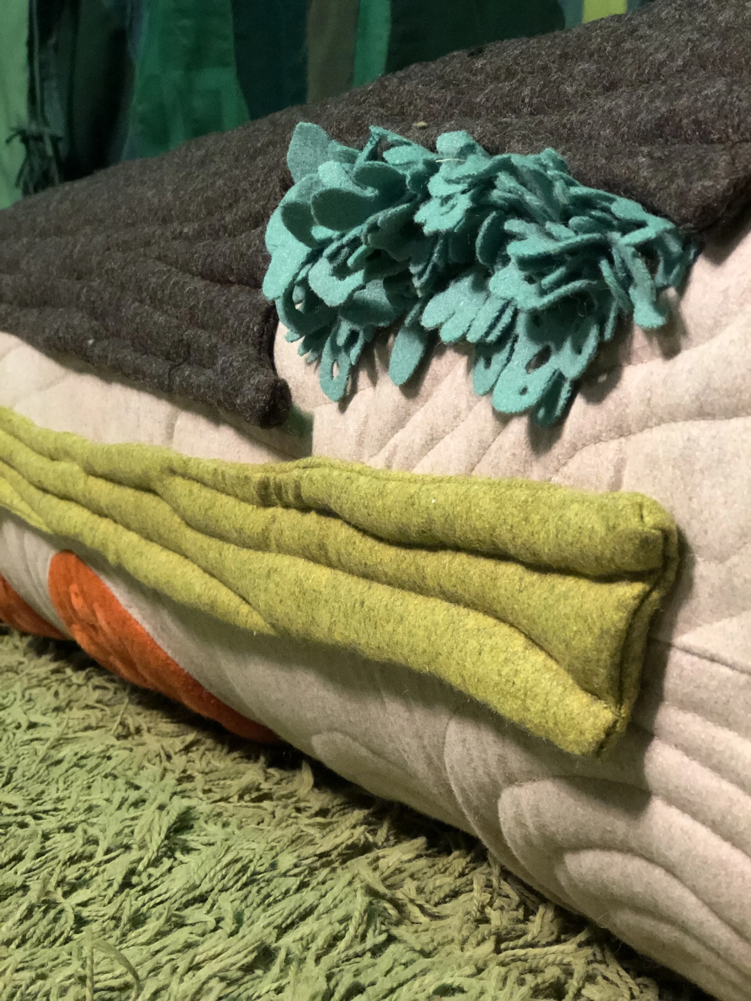 Tekstil installasjon med ulike tuftet og møbelstoffer i ull