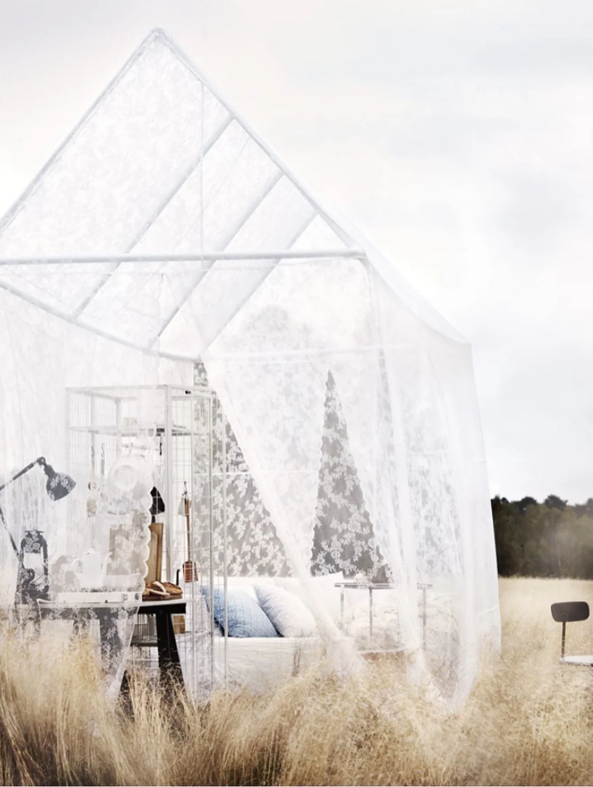 Søm av telt i blonde gardiner. Søm av madrass trekk.