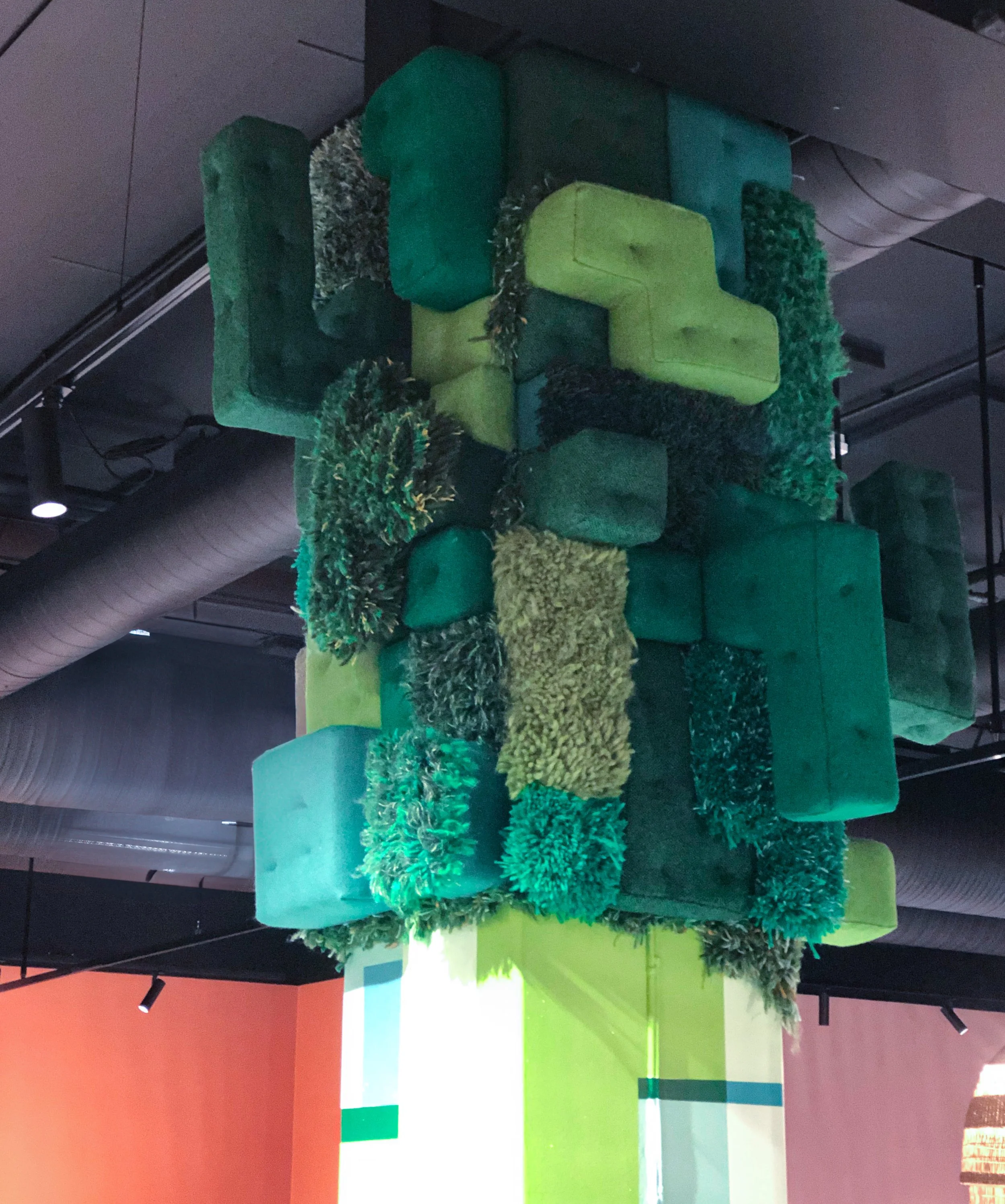 3 pillarer med ulike utrykk: i midten, pixilert Tekstil tre med ull stoffer